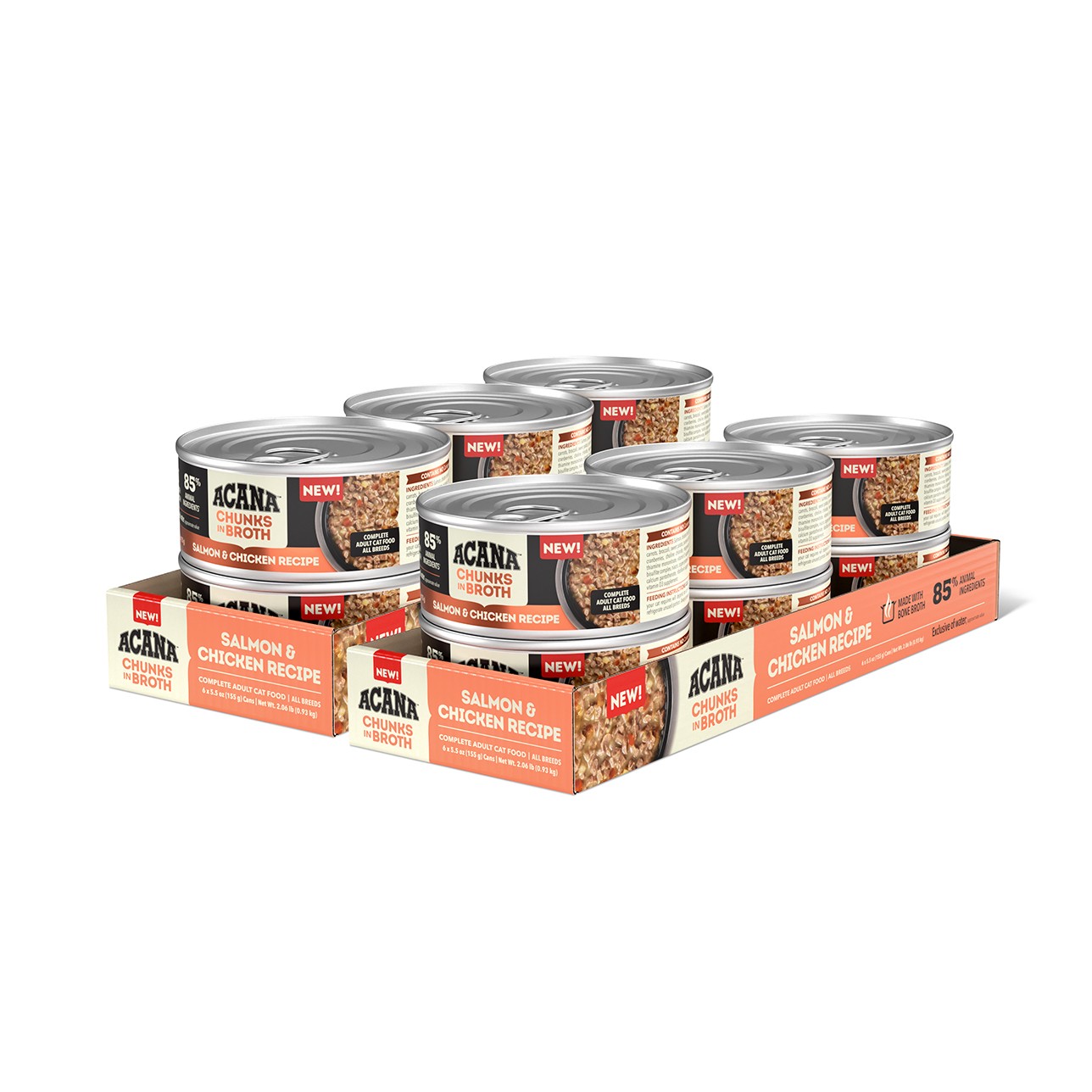 Nurture your cat with the protein-rich animal ingredients and delicious bone broth in ACANA™ Chunks in Broth wet cat food! Crafted with 85% animal ingredients*, Salmon & Chicken Recipe provides your cat with the nourishing animal protein they crave. Each can features nourishing animal ingredients, including savoury salmon and chicken, in satisfying chunks. It also includes hydrating fish, chicken and turkey broths to tantalise your cat’s tastebuds and provide them with the moisture they need. It also helps support your cat’s immune health and skin & coat health. Nurture your cat with a wet cat food that helps them feel so good inside, you’ll see it on the outside!