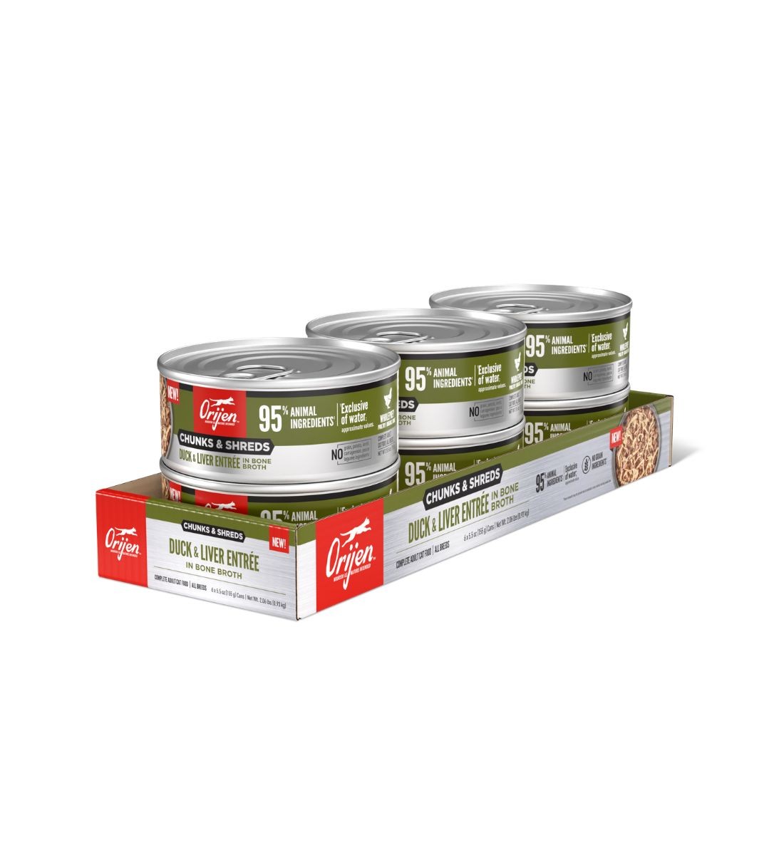 Nourish your cat completely with hearty WholePrey animal ingredients and real shreds of meat, poultry or fish in ORIJEN™ Chunks & Shreds Wet Cat Food! Cats are obligate carnivores, so they thrive off a diet packed with animal ingredients. That’s why Duck & Liver Entrée recipe includes a whopping 95% animal ingredients¹ to provide your cat with the Biologically Appropriate nourishment they were born to eat. This diet also includes succulent WholePrey ingredients like chicken liver to provide your cat with rich and varied nutrients. Bone broth helps support your cat’s hydration, while also adding tempting flavour. Nourish your cat with the texture and variety of raw animal ingredients packed into every can of ORIJEN™ Chunks & Shreds.