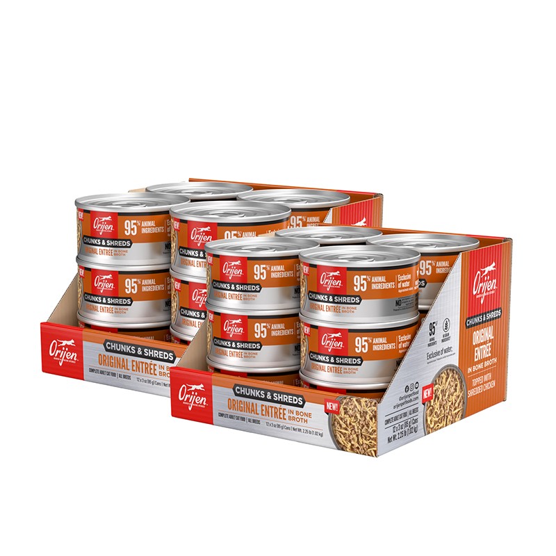 Nourish your cat completely with hearty WholePrey animal ingredients and real shreds of meat, poultry or fish in ORIJEN™ Chunks & Shreds Wet Cat Food! Cats are obligate carnivores, so they thrive off a diet packed with animal ingredients. That’s why Original Entrée recipe includes a whopping 95% animal ingredients¹ to provide your cat with the Biologically Appropriate nourishment they were born to eat. This diet also includes succulent WholePrey ingredients like chicken liver to provide your cat with rich and varied nutrients. Bone broth helps support your cat’s hydration, while also adding tempting flavour. Nourish your cat with the texture and variety of raw animal ingredients packed into every can of ORIJEN™ Chunks & Shreds.